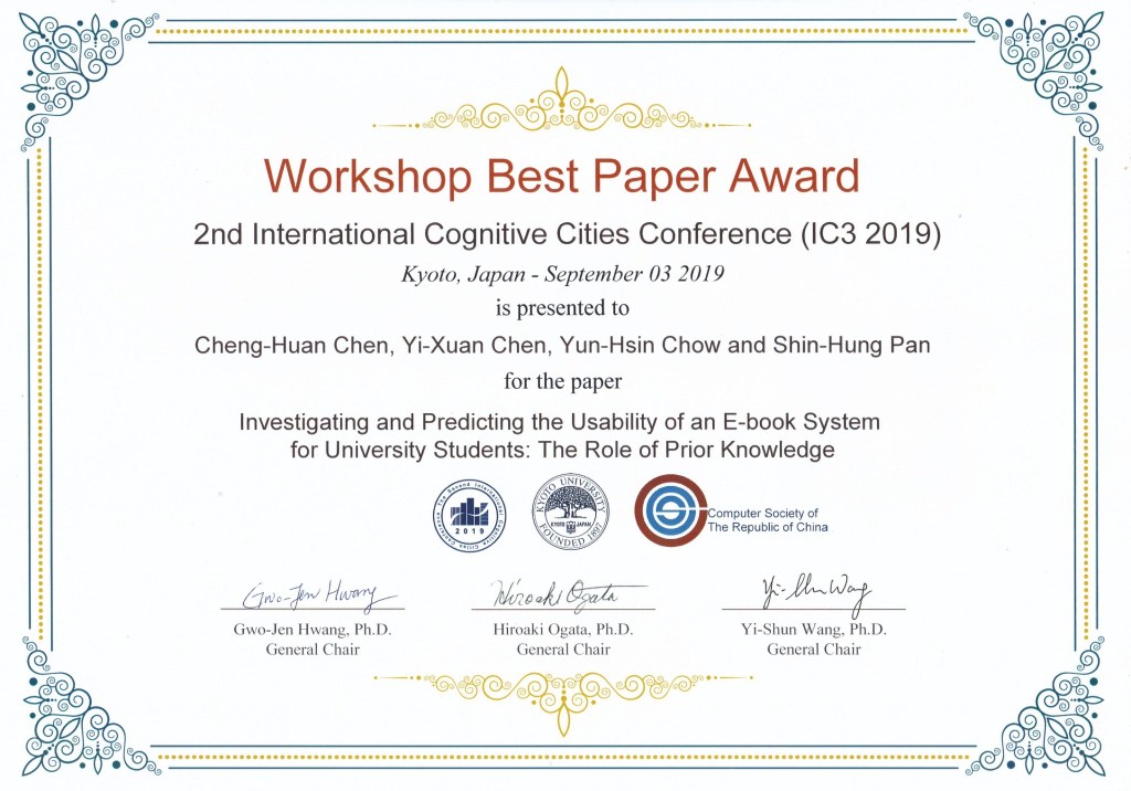 亞洲大學行動商務與多媒體應用學系陳政煥助理教授、大四陳奕瑄同學、周允歆同學、潘信宏助理教授合著之第二屆International Cognitive Cities Conference(IC3 2019)國際研討會論文《Investigating and predicting the usability of an e-book system for university students: The role of prior knowledge》,由陳政煥老師帶領陳奕瑄同學赴京都研究園區(Kyoto Research Park)於2019年9月4日發表,並獲頒工作坊最佳論文獎(Workshop Best Paper Award)。