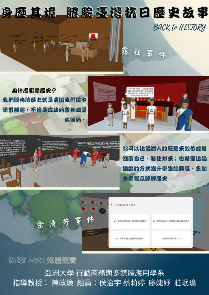 《身歷其境—體驗臺灣抗日歷史故事》擬透過情境式學習幫助國小高年級學生學習臺灣兩大抗日歷史事件──霧社事件和余清芳事件,以VR為媒介讓學生像是能夠親身經歷當時的情況,讓學生與NPC互動及進入虛擬教室練題,希望學生能從中了解當初歷史的走向並進行反思:若角色對調,他們是否也會做出相同的決定。